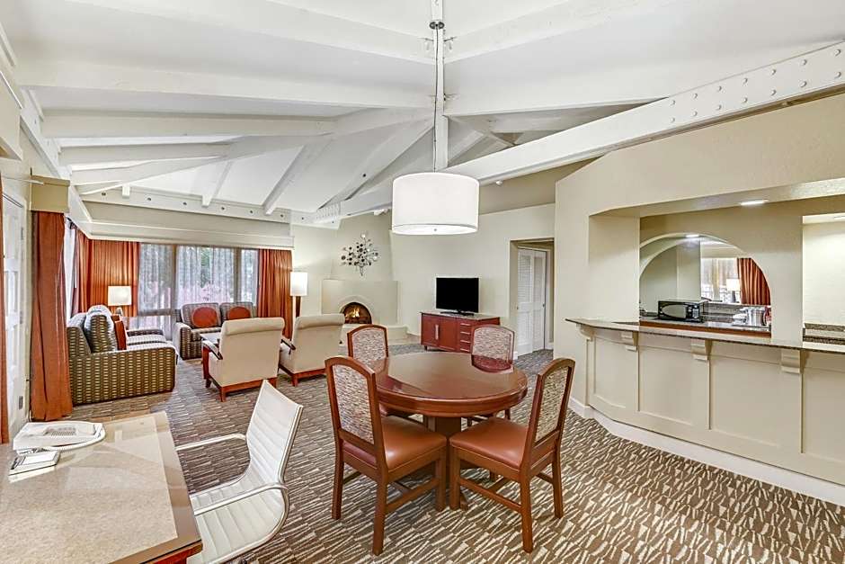 A living room with a sofa bed, 2 flat-screen TVs, a work desk and a mini refrigerator are featured in this room. An private bathroom is also included.